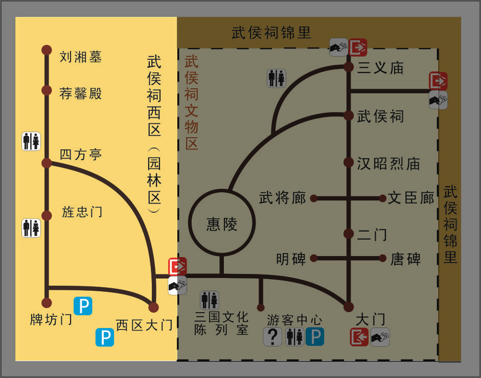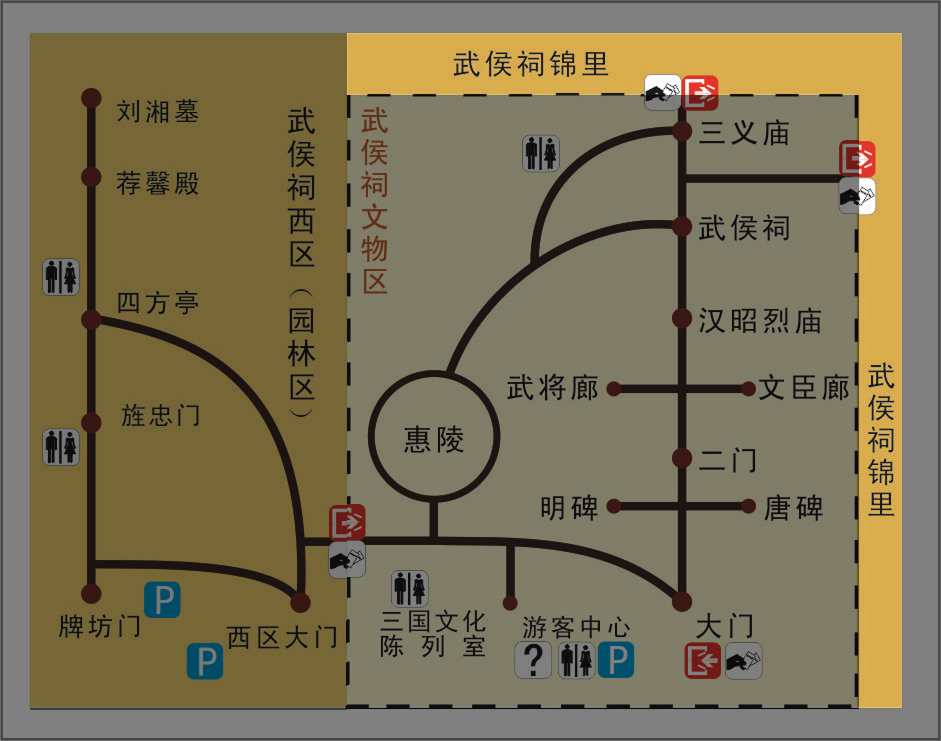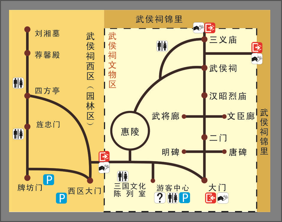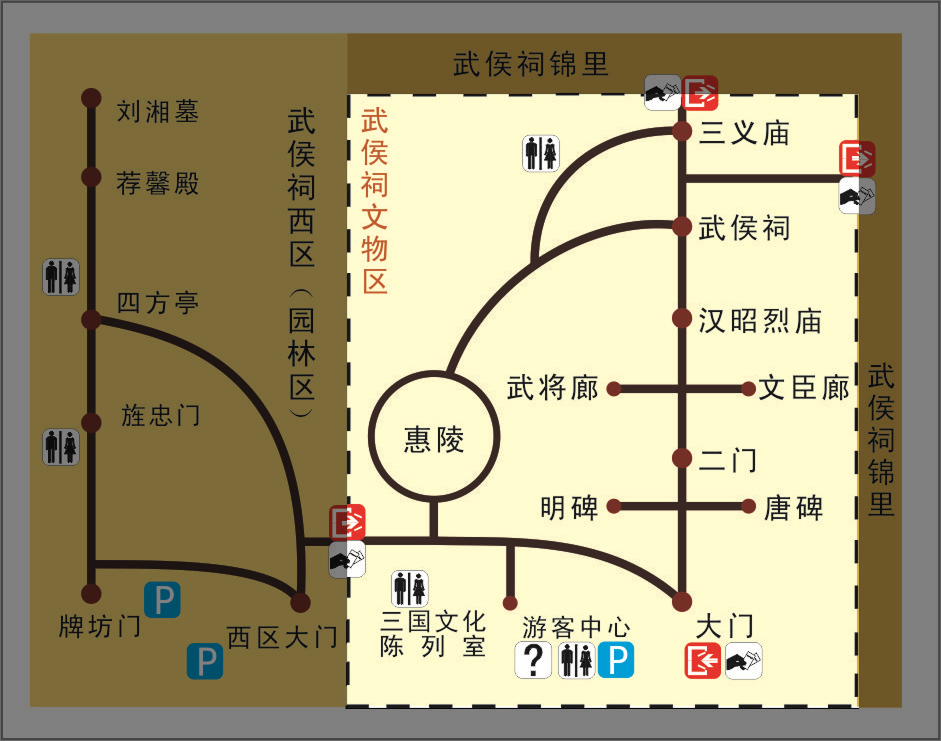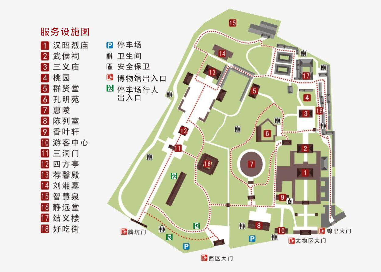 成都武侯祠博物馆园林区(西区)为禁烟区域,请勿在园区内吸烟;严禁攀爬、触摸、刻划、涂污任何古建、文物及景观;禁止踩踏草坪、攀折花木,禁止在水域垂钓、戏水;禁止乞讨、拾荒。